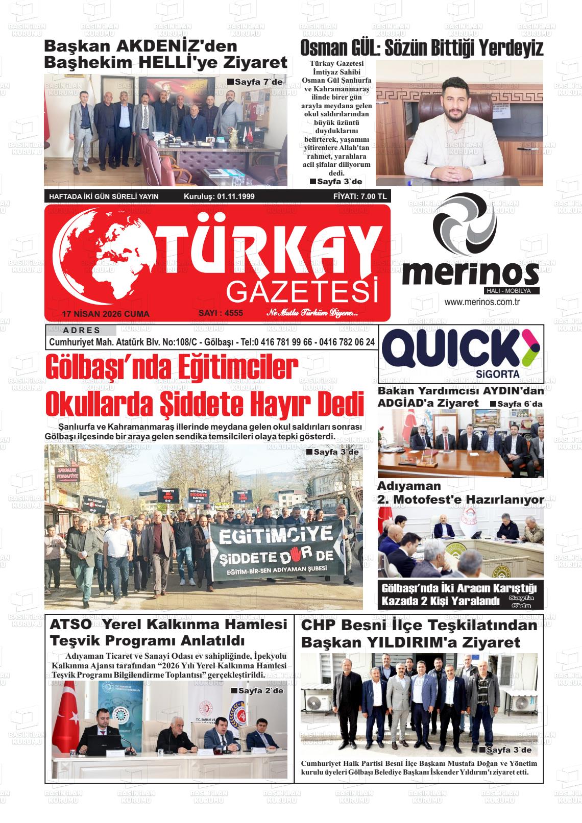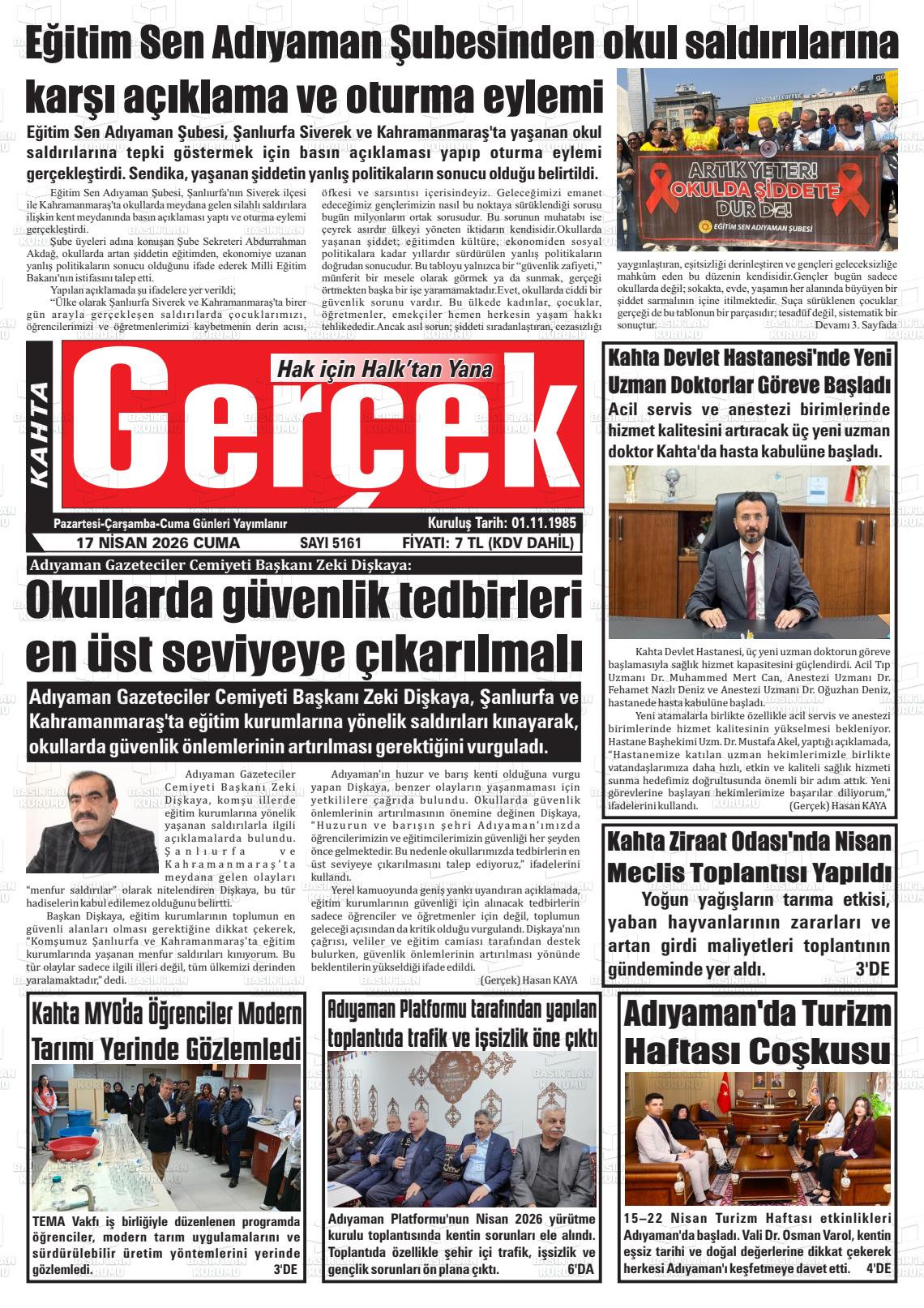 Adıyaman Yerel Gazeteleri 17 Nisan 2026, Cuma Günü Manşeti