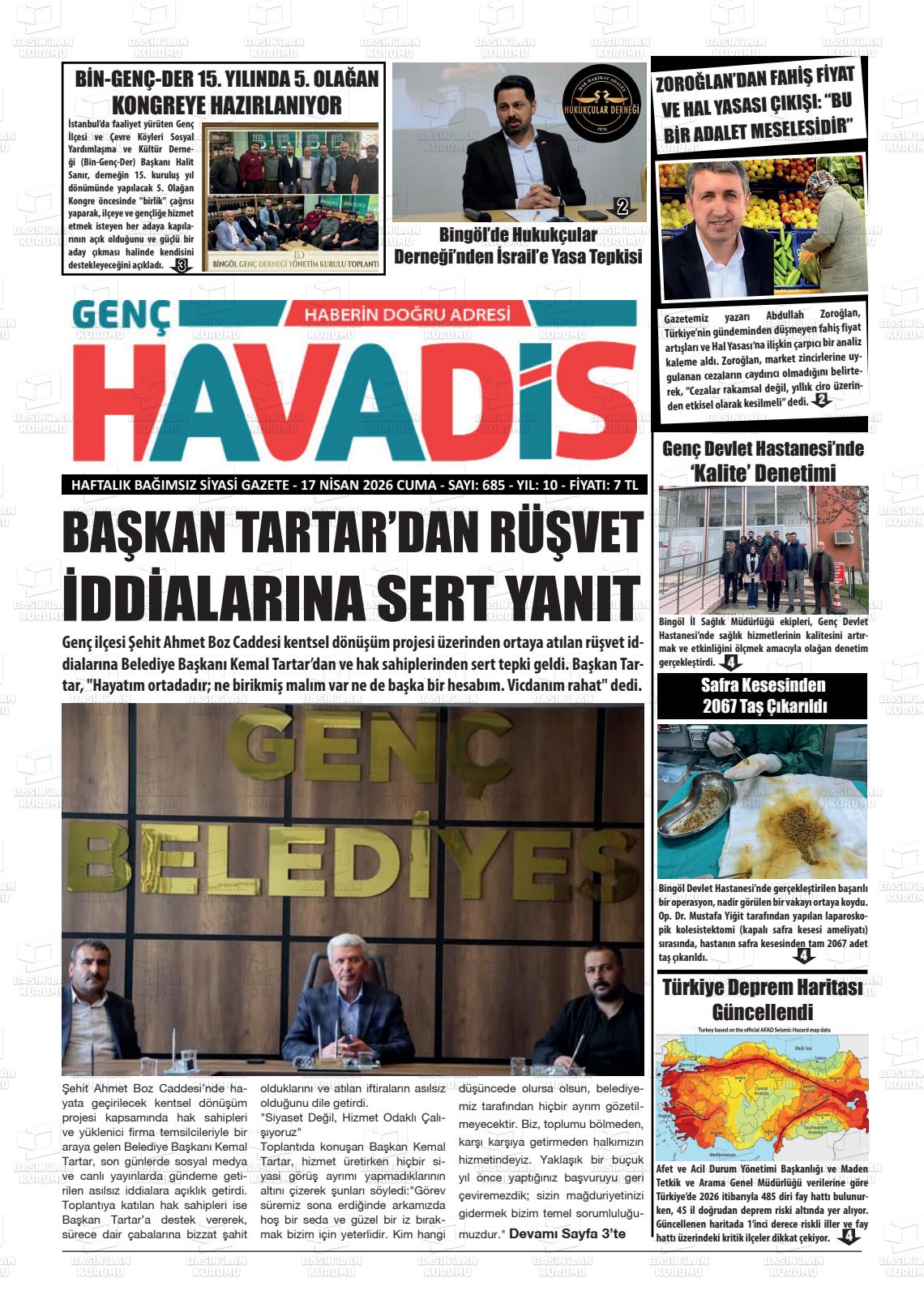 Bİngöl Yerel Gazeteleri 17 Nisan 2026, Cuma Günü Manşeti